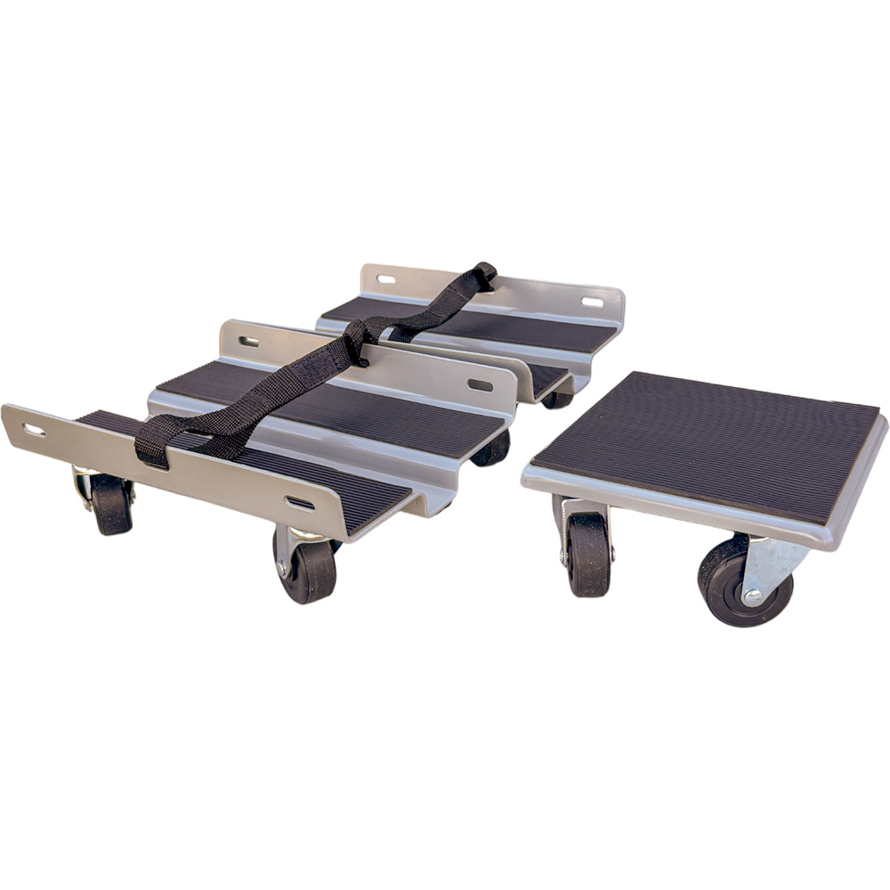 Chariot en 3 pièces grises avec recouvrement en caoutchouc sur le dessus. Idéal pour déplacer la motoneige en toute sécurité.